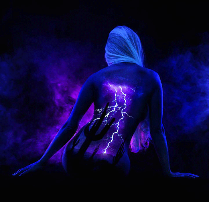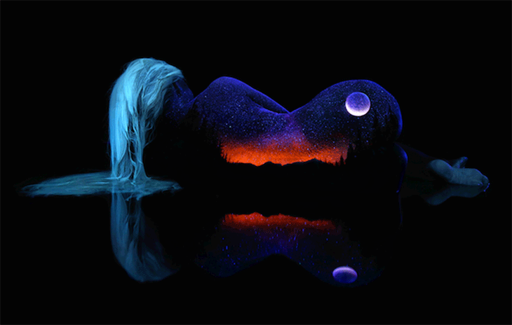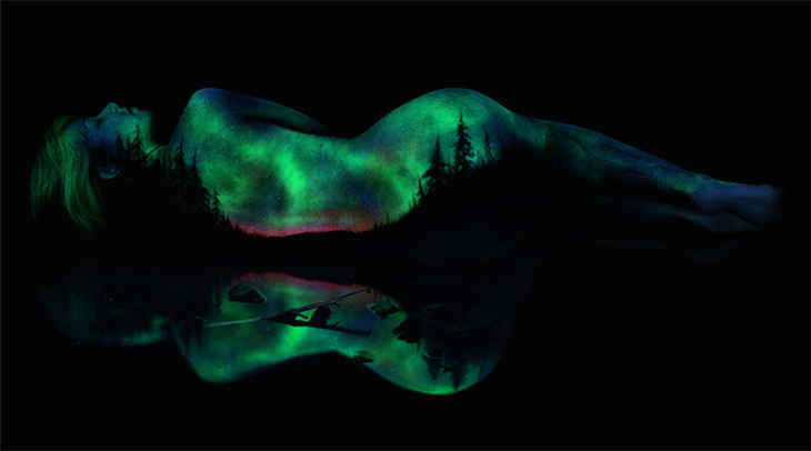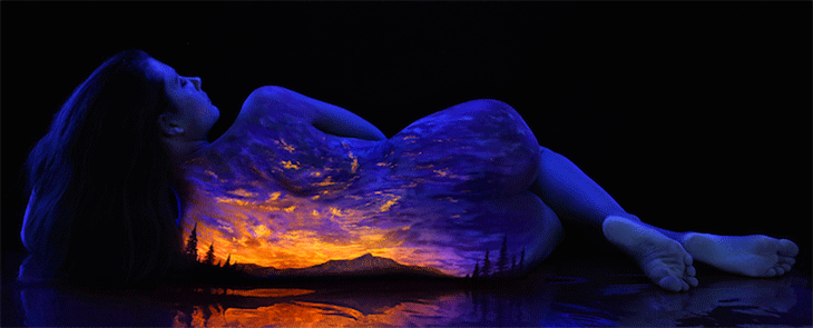 Image courtesy: John PoppletonJohn’s personal goal was to create something original and to be different but fantasy portraits were never part of his plan. In 2010, while suffering from a sleepless night in a hotel room bed, John received his inspiration for using black light and he was off on what has become the biggest adventure of his career. His Black Light Bodyscapes consists of the beauty of female form combined with gorgeous nature scenes .The fluorescent pigments are painted on the backs of the female models, who are then photographed under black light to produce these extraordinary images. Featuring spectacular phenomena such as oceans during sunset, mountain ranges under moonlight, shimmering auroras, and even cosmic scenes of stars and galaxies, the body paintings are all stunning to behold.